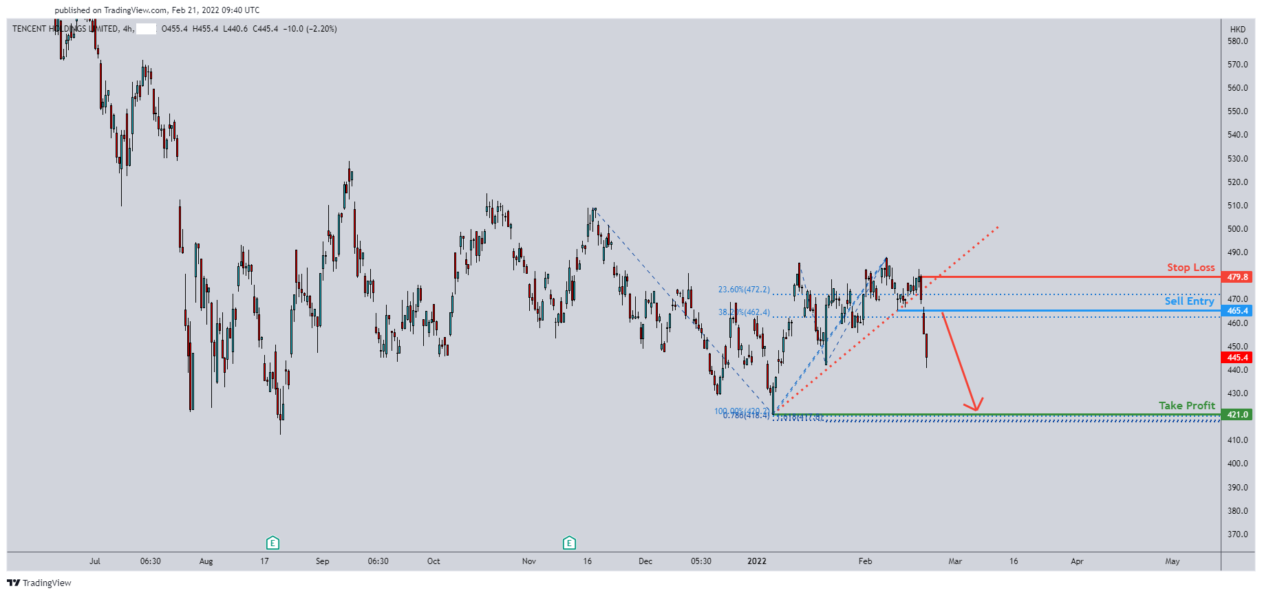 Hey guys! Anyone else eyeing ?I'm seeing prices breaking my ascending trendline and going on a strong bearish momentum. Looking to get in at the sell entry @ 465.4 in line with 38.2% Fibonacci retracement and also horizontal overlap. Probably going to short to 421.0 where the next swing low support where i see an area of Fibonacci confluences and have my stop loss at 479.8 which is somewhere closer to the 23.6% Fibonacci retracement level.