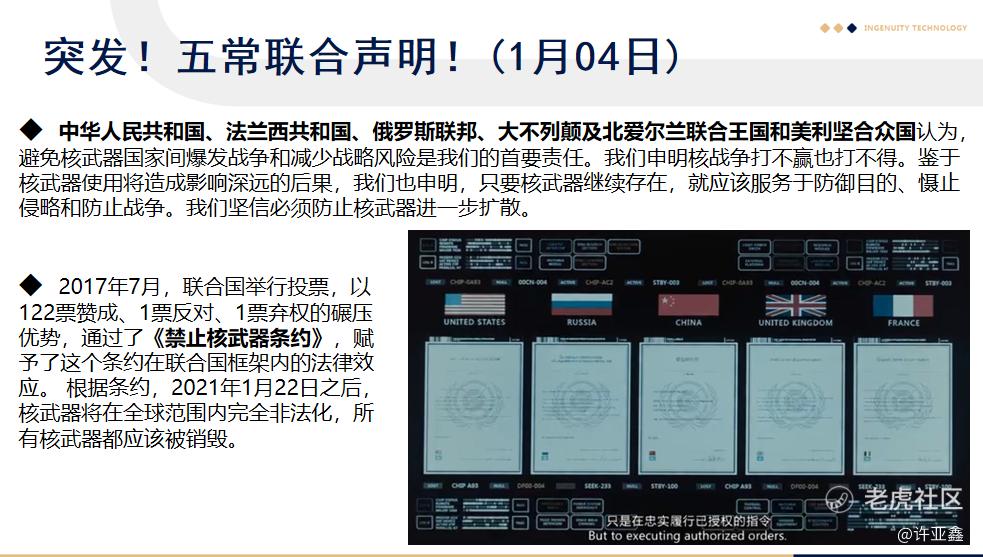 另一种情况便是,俄局面继续恶化,北约以此为借口,增兵乌克兰,与北极熊开始撕逼。那么在乌克兰的领土上,必然会掀起一波代理人的战争。这种情况下,我们回过头再去看年初1月04日五常发表的声明,是不是有点意味深长呢?