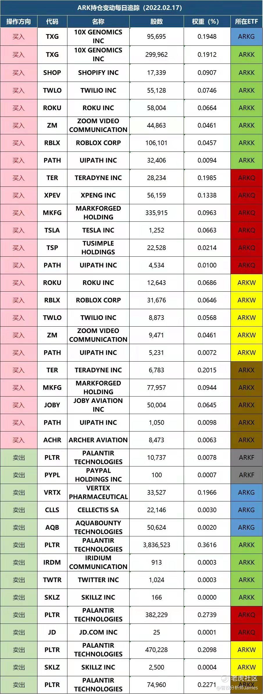 【Ark旗下基金持仓变化小结,2022年02月17日】