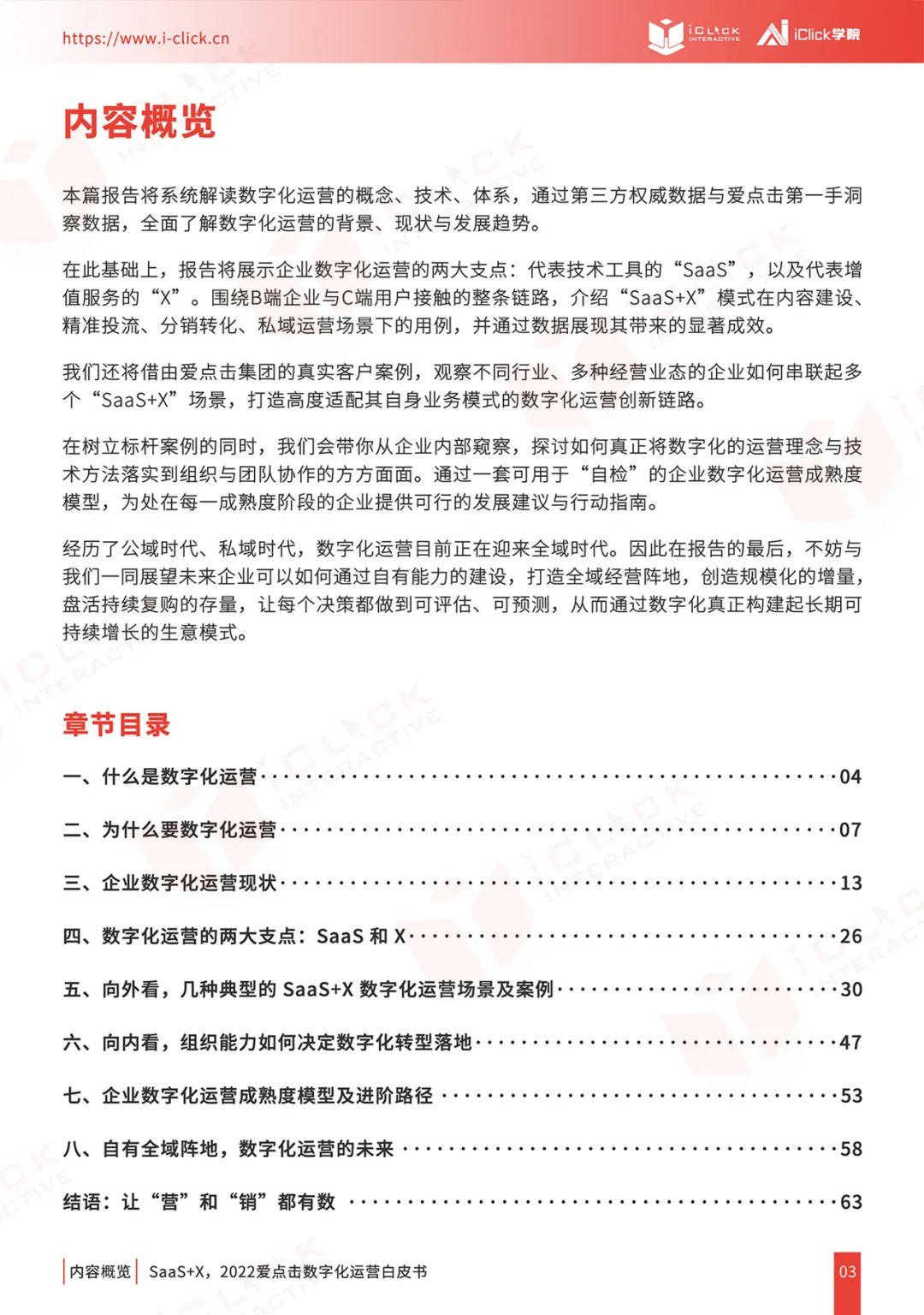 作为中国领先的企业数字化运营和营销云平台,爱点击集团iClick(NASDAQ:ICLK)今日正式对外发布《SaaS+X,2022爱点击数字化运营白皮书》(以下简称:白皮书)。白皮书由爱点击集团旗下iClick学院撰写制作,集合了集团多年来在数字化领域的深度研究成果,融汇了超过1000家标杆客户的服务经验,旨在为所有正在展望数字化、尝试数字化、深入数字化,以及在数字化过程中遇到问题与障碍的企业提供参考,并帮助全球企业客户在“营”和“销”的商业场景下实现高质量的可持续发展。