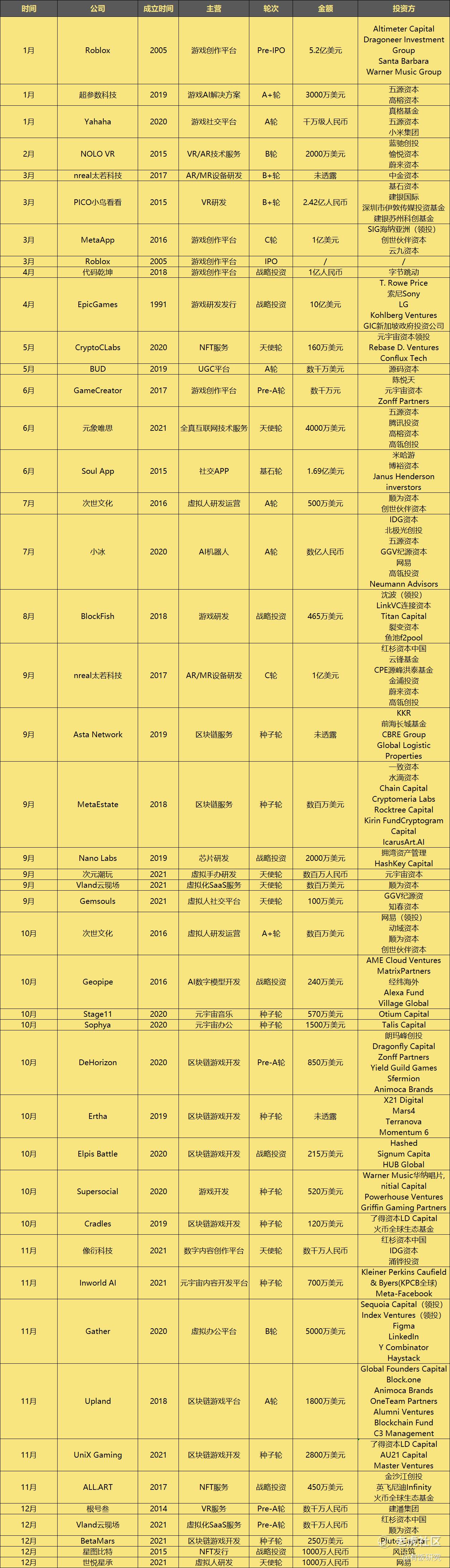 如果按照元宇宙“BIGANT”六大核心要素来看,几乎所有融资都是元宇宙相关,太多太杂,所以有饭只选了2021年在融资消息、公司主营业务形容提到元宇宙的。