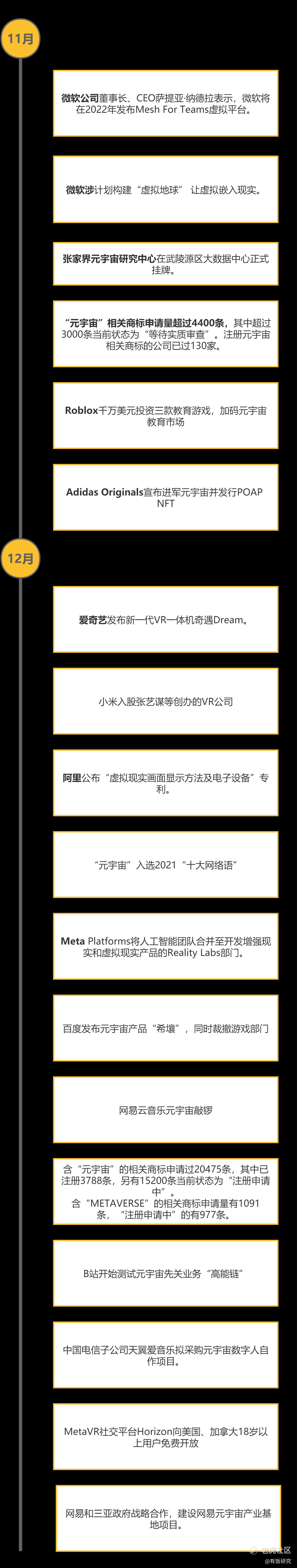 所以,我们分企业观点、投融资、主要事件三个部分,做了一个2021元宇宙时间轴。