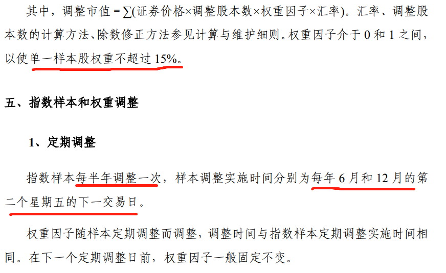 3、单一个股最高权重15%,每年定期调整2次,6月和12月各调整1次。