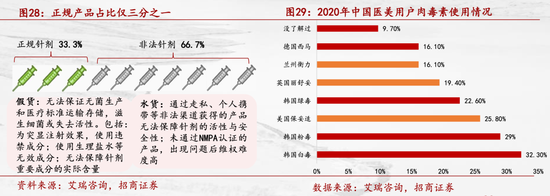 医美赛道在飞速发展的同时,也面临着监管执法效果不理想问题,除了假冒伪劣产品之外,水货市场也很泛滥。以肉毒素为例,目前市面上销售的肉毒素产品中,正规渠道的行货产品仅三分之一,剩下全是非法渠道的水货。
