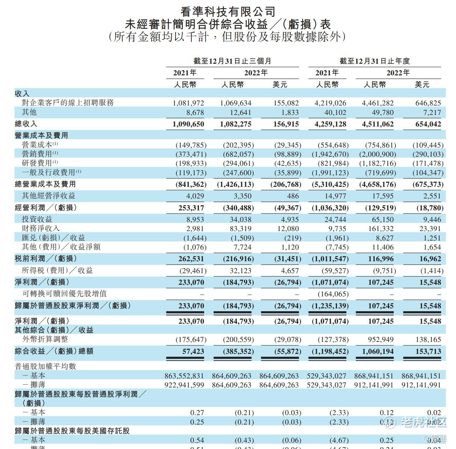 BOSS直聘2022年第四季度营收为10.82亿元(1.57亿美元),与2021年同期持平。