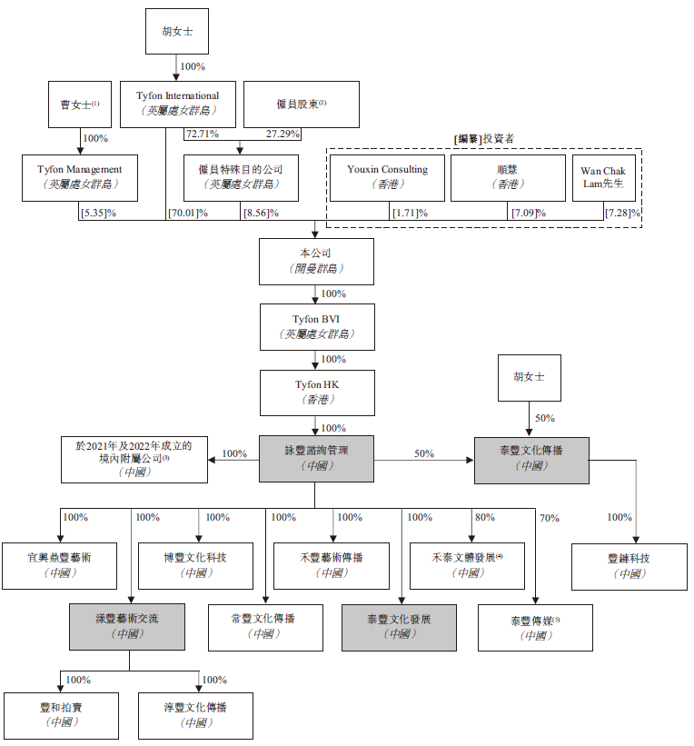 招股书显示,泰丰文化在上市前的股东架构中,其控股股东为胡婷女士,其透过Tyfon International持股70.01%、通过员工持股平台间接持股8.56%,合计持股78.57%。