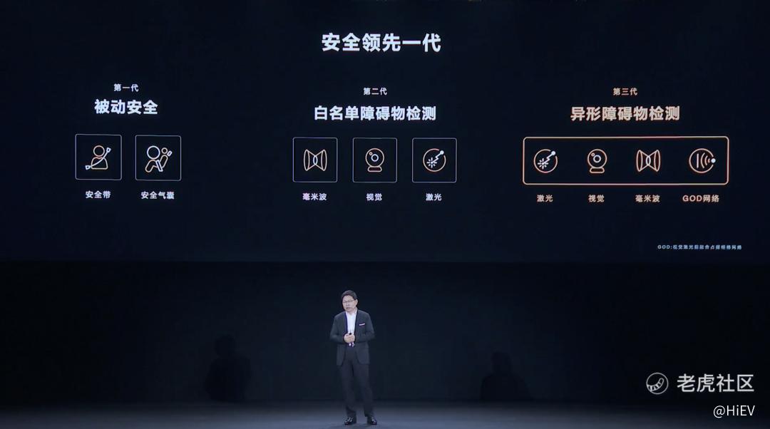 在这里,华为定义的代际包含了主被动安全。第一代指的是安全气囊与安全带;第二代指的是毫米波、视觉与激光雷达探测在内的主动安全功能。而余承东认为,华为 ADS 2.0 在安全性上已经进入了第三代,即在第二代基础上增加了GOD网络。