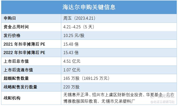 在A股数字经济如火如荼演绎的时候,北交所除了曙光数创比较正宗外,其他基本都是属于概念题材。本周五(4月21日)海达尔申购,公司业务结构中包括服务器滑轨,发行定价10.25元/股,对应2022年扣非净利摊薄后15.43倍,公司没有老股,预计发行上市后流通市值仅为1.07亿元。
