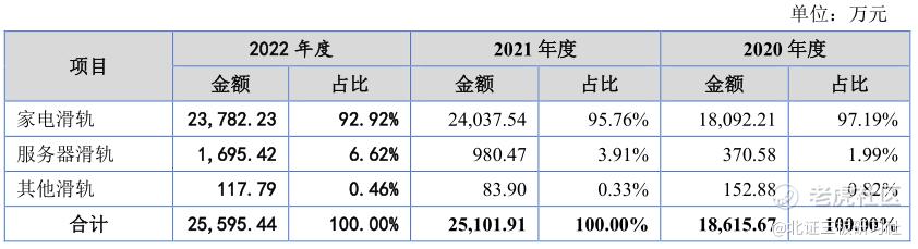 公司主要从事精密滑轨,下游应用于家电、服务器等领域。目前营收来源以家电滑轨为主,服务器滑轨占比快速增长。家电滑轨和服务器滑轨的市场规模都不大,公司家电滑轨以冰箱类为主,2022年冰箱滑轨市场空间约为11亿元,服务器滑轨根据IDC预测数据测算对应2025年市场空间约为6.5亿元,市场空间都不大。