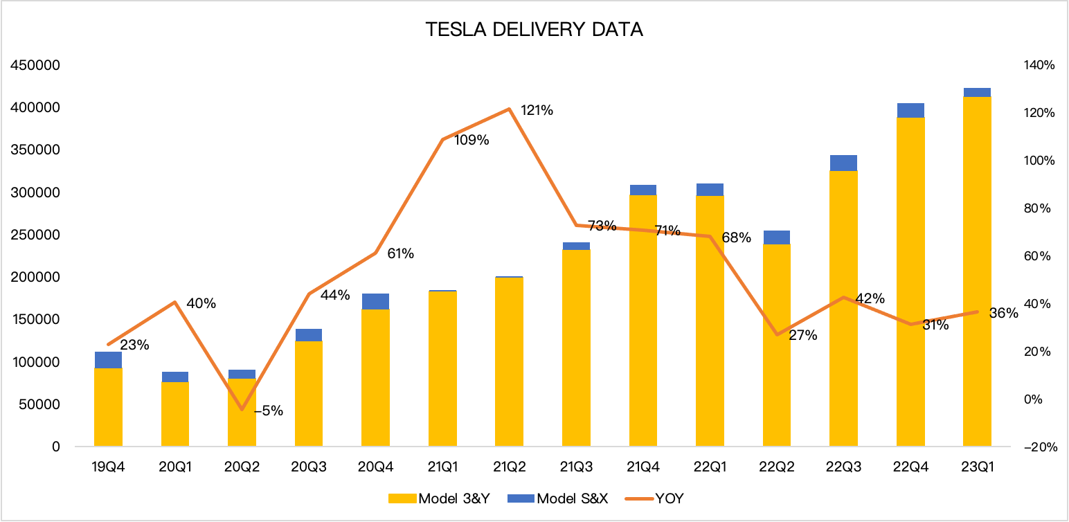 造成本次营收下滑的主要原因是汽车销售收入的环比下降,这次的数据基本算是符合我之前的预期,交付数据是明牌,早在月初,特斯拉就已公布1季度的交付数据,特斯拉2023年第1季度交付422,875辆车,同比增长36%;其中,Model S/X交付10,695辆,同比下降27%;Model 3/Y交付412,180辆,同比增长40%。