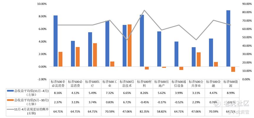 从标普500的11个一级行业的统计结果来看,工业、材料、房地产、通信设备和能源这几个行业,“Sell in May”现象非常明显。11月-4月的平均收益,非常显著的高于5月-10月。相反,非必需消费、医疗和信息技术等行业,这种效应并不明显。