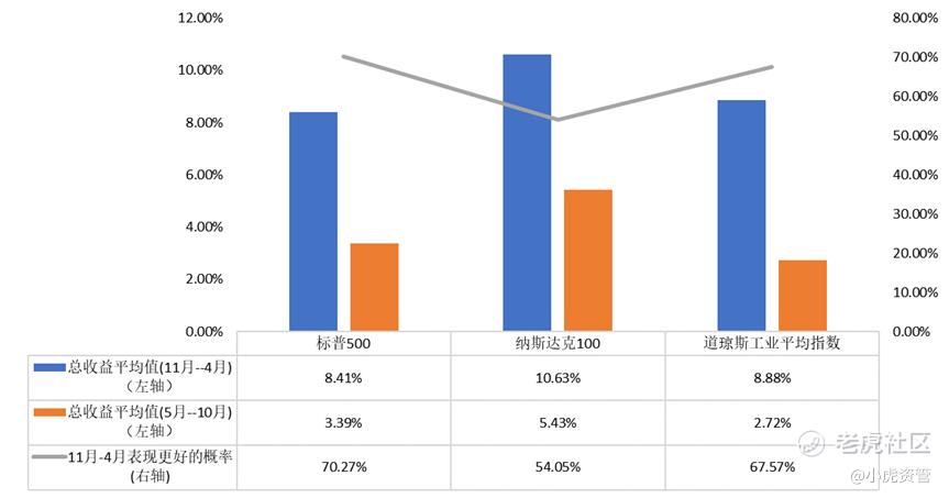 “Sell in May and Go Away”是美股市场广为流传的一句话,其潜在含义是,美股每年11月到次年4月这半年期间的表现,要好于每年5月到10月的这半年的表现。关于这种日历效应形成的原因,有人认为是受4月中旬美国个人所得税申报截止日的影响,有人认为是由于大部分基金经理在年末和年初投资会更为激进,而在年中则更倾向于度假休息。所以,到底这句谚语描述是真的吗?我们且用客观数据说话。