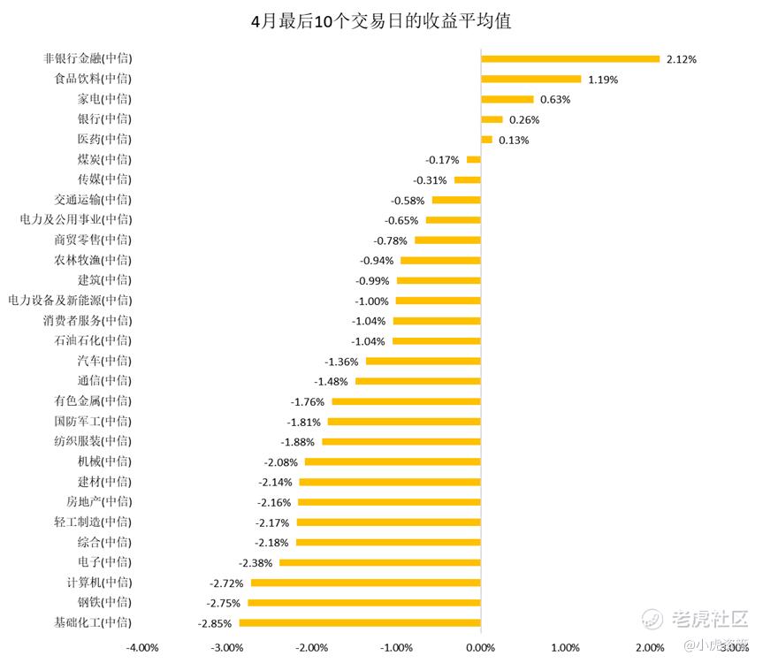 与“周四砸盘日”类似,在中国市场中还有一个广为流传的节前效应。意思是,每当春节、五一、十一这种小长假前夕,由于大家都需要把钱取出来换成现金,容易形成一个卖压,造成股市的下跌。下图展示了从2005年到2022年,30个中信一级行业指数,在每年4月最后10个交易日的平均总收益。