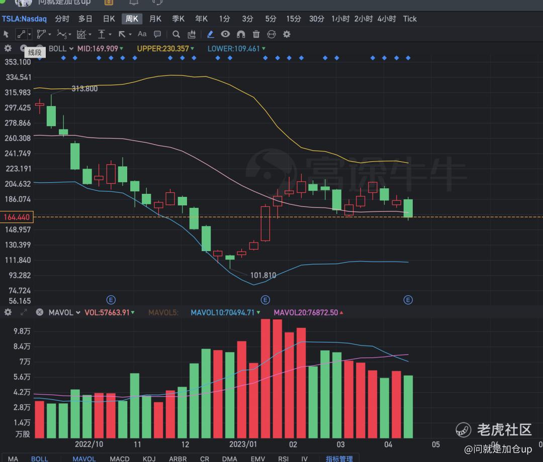 在一月份股价暴拉之后,目前股价在160-200的区间已经连续震荡三个月,财报后股价周线再次跌破布林线中轨,也到了震荡区间的低点。如果继续向下,基本上就是破位。如果你错过了之前100美金抄底特斯拉的机会,那么这次可以准备好,按照当前股价的运行,继续向下的概率挺大,财报没有太大的亮点,一切业务都在有条不紊的进行,如果没有高速增长和新故事,那么维持高估值是困难的,现在5000亿美金市值,如果可以再次回到3000亿美金以下,可以考虑再上车了,不要把特斯拉看做一个汽车制造公司,软件业务才是未来值得期待的地方,如果只是为了对比车销量和业务,那基本就没必看了。