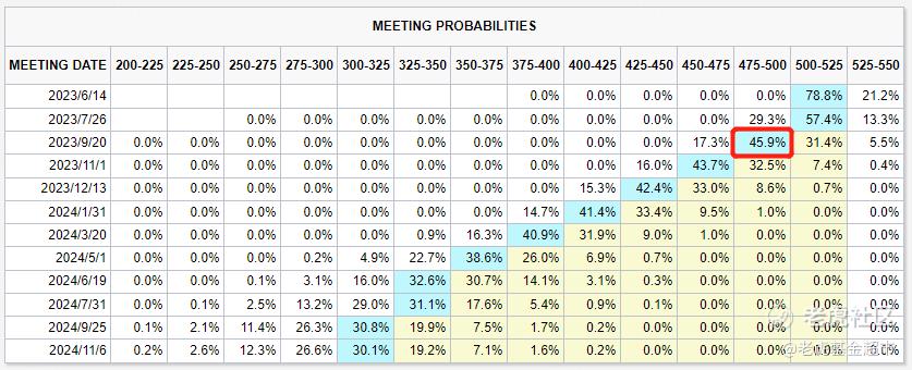 美国近期公布的4月非农数据仍显强劲,数据显示4月美国新增非农就业25.3万人,高于预期的18.5万人。同时,美国4月通胀整体虽然比3月环比下降0.1个百分点,整体符合预期但降幅有限,这些数据都隐约释放出美联储暂停加息的信号。芝商所美联储观察工具显示,美联储6月不加息的概率达到78.8%,加息25基点的概率只有21.2%。而与此同时,9月降息的概率则超过45%。