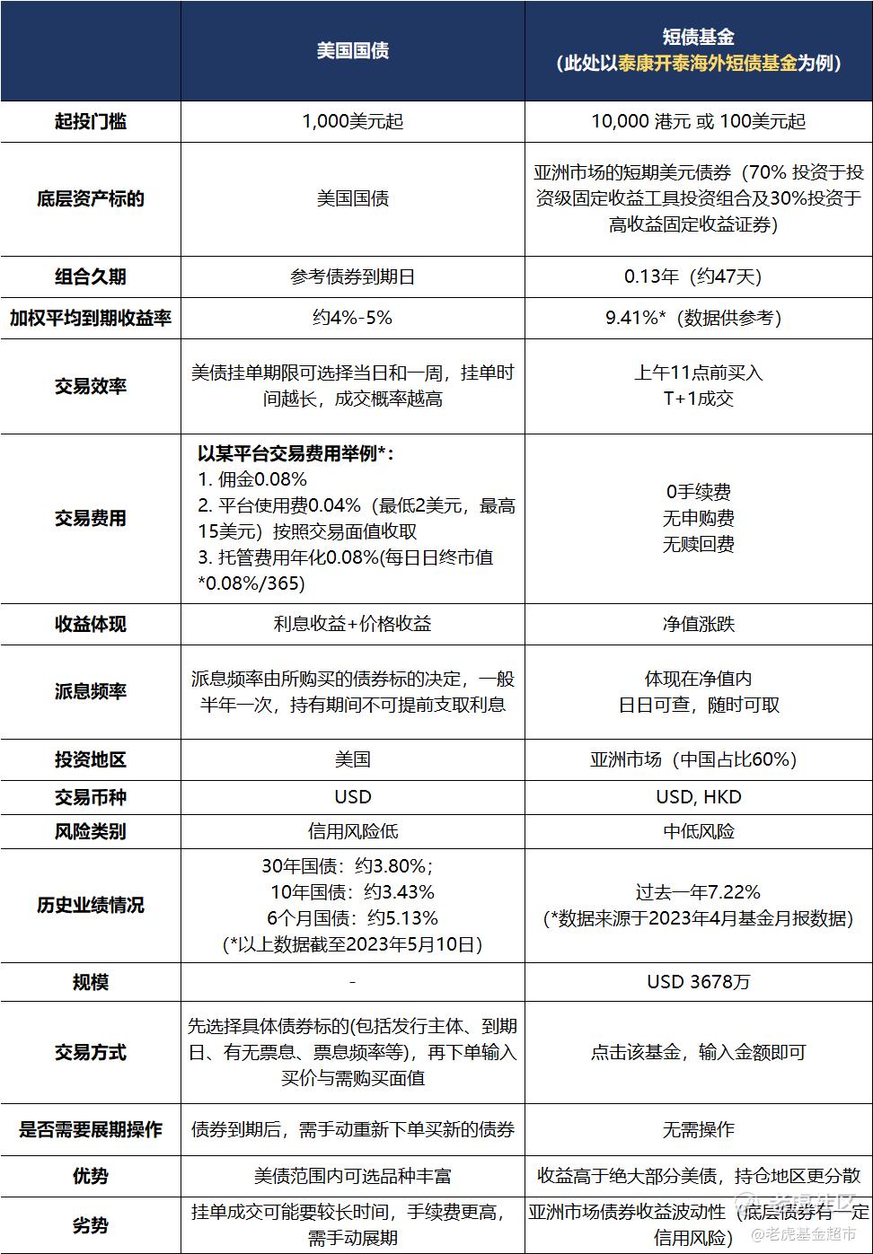 从美债和短债基金的收益风险特征来看,美债的信用风险更低。二者主要区别在于底层投资类别不同,短债基金主要投资于到期时间1年以内的债券,例如 $泰康开泰海外短债基金A类美元累计份额(HK0000369196)$ 主要投向亚洲市场的短期美元债券。