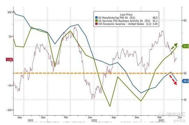 换个视角看下欧元区各国,德国5月制造业PMI初值为42.9,为2020年5月以来新低;法国5月制造业PMI46.1,小幅超预期(看样子上个月来谈点生意还是有点用的),服务业PMI和中和PMI均不及预期。