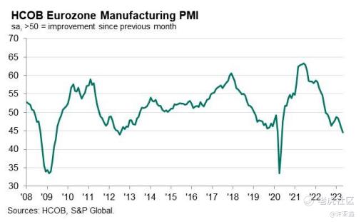 咱们先看今天欧洲的一组数据:欧元区5月制造业PMI为44.6,不及预期的46,前值为45.8,创36个月新低。