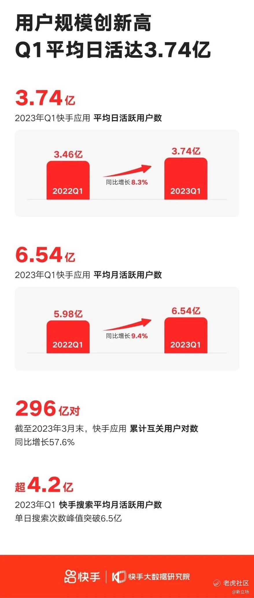 目前,快手用户池仍然保持较快增长。截至2023年Q1,快手DAU达到3.743亿的新高,同比增长8.3%;月活跃用户为6.544亿,同比增长9.4%。