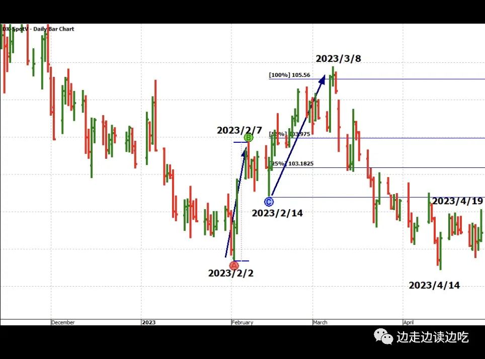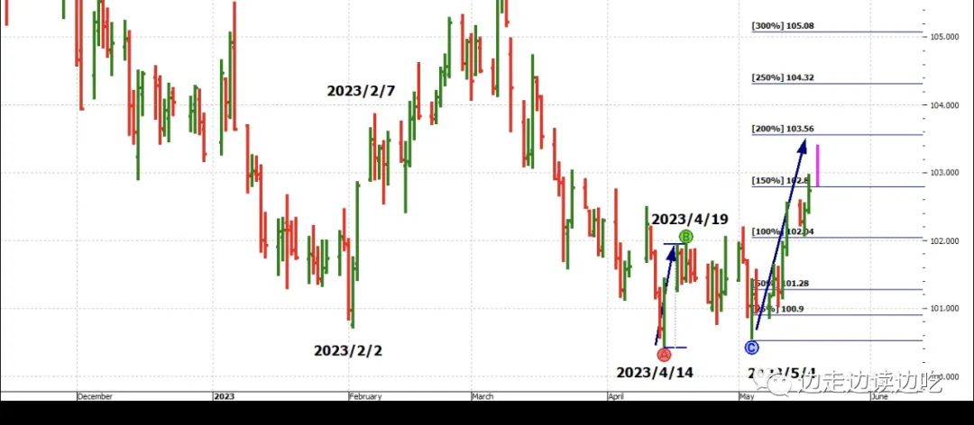 2023/5/18: 美元指数昨夜突破了小双底上升的阻力位,今天升势如虹,冲到了大双底上升的100%阻力位$103.59。
