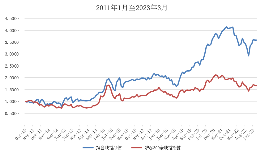 实际组合从2011年初至2023年3月末净值是从1元至3.58元。年化收益率是11%。