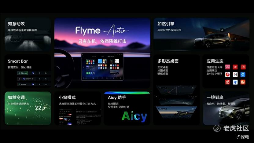在FlymeAuto纯车机状态下,将拥有知意动画、Smart Bar、如然空调、小窗模式、Aicy助手(免唤醒词、全场景可见即可说)、如然引擎、多形态桌面、应用生态、场景模式等等。