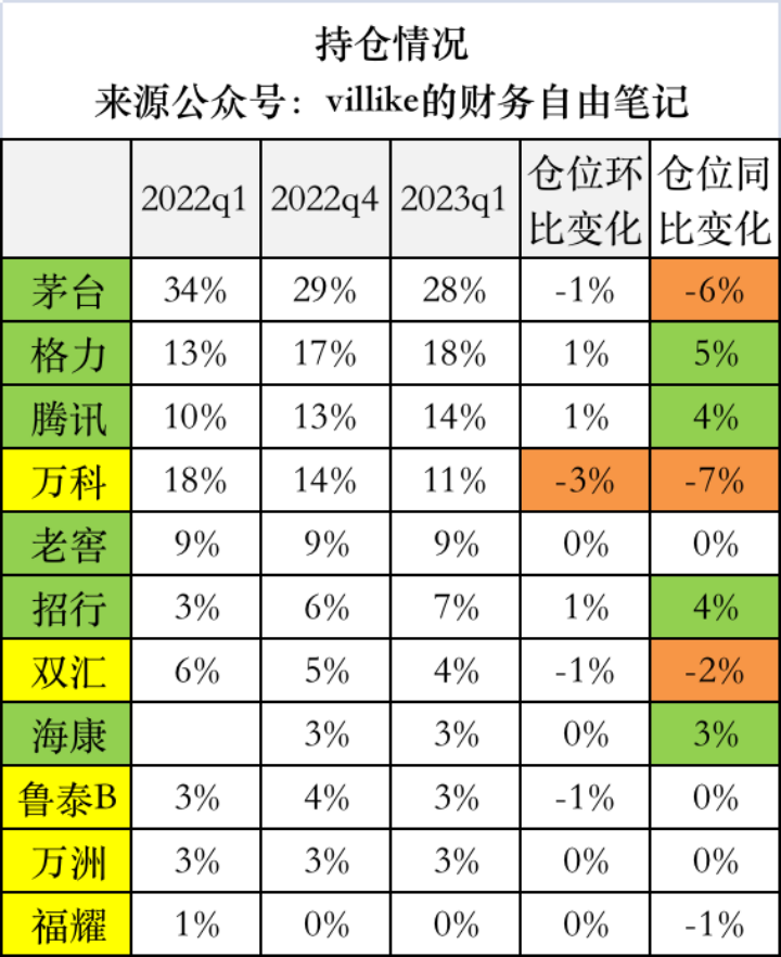 一季度相比于2022年底,仓位占比变化超过1%的只有万科,主要原因是万科股价的下跌,以及其他持股的追加投入和股价上涨。