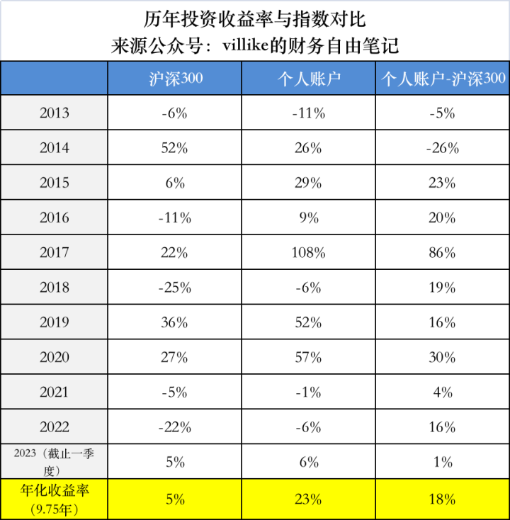 从年化收益率的角度来看,由于一季度账户表现不错,从我2013年7月投资到如今,差不多9.75年,这段时间的账户年化收益率是23%,比去年底的22%略有提高。