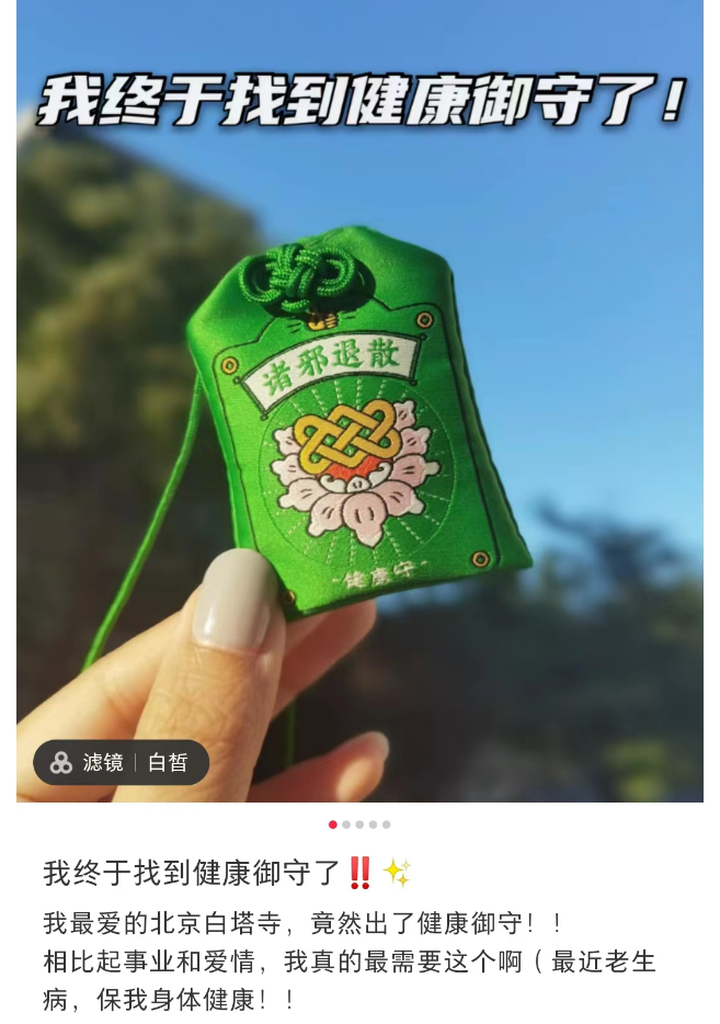 应运而生的普陀山时来运转御守,以及今年热度攀升的北京白塔寺健康御守,扩展到学业、金钱、健康、交通安全的国产御守,也开始拓宽整个行业的业务范围。