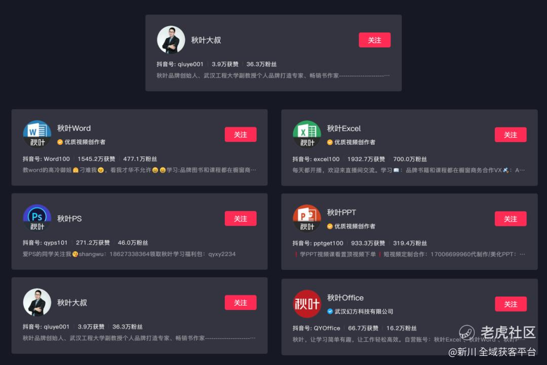 对于打造专业人设IP的品牌,则可以从产品/服务/解决方案出发打造矩阵号,如Office在线教育课程开发运营商“秋叶”在抖音开设了“秋叶Excel”“秋叶Word”“秋叶PPT”等多个优质创作者账号,提供了不同领域的产品服务,每个账号的粉丝量均在100W以上,不仅更好地满足了用户的差异化知识获取需求,还可以纵深服务粉丝,使得品牌的整体形象得以加强;