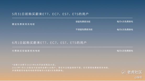 在2023年5月31日(含)前支付定金购买上述车型,及2023年7月31日 (含)前支付定金购买全新ES8车型的用户,首任车主权益保持不变,仍按照是否安装免费充电桩享受每月4次或6次免费换电。