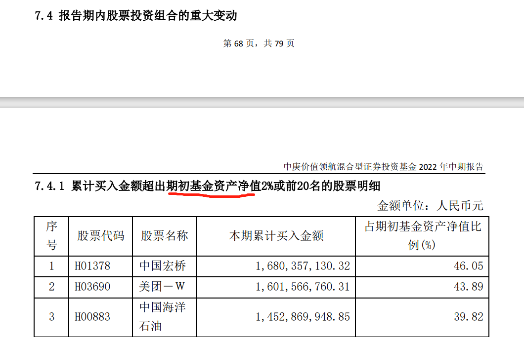 比如我这里用的就是著名基金经理中庚基金的丘栋荣的中报的截图来科普,在中报和年报的第7或是8大部分里面有数据公布,细分项是——报告期内股票投资组合的重大变动。