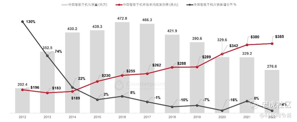首先,2022年智能手机出货量相比2016年的峰值减少了41.5%,但销售额只下降了11.7%。Counterpoint的数据显示,自2014年至今,中国智能手机的ASP,即年平均出货价格,一直保持同比增长。