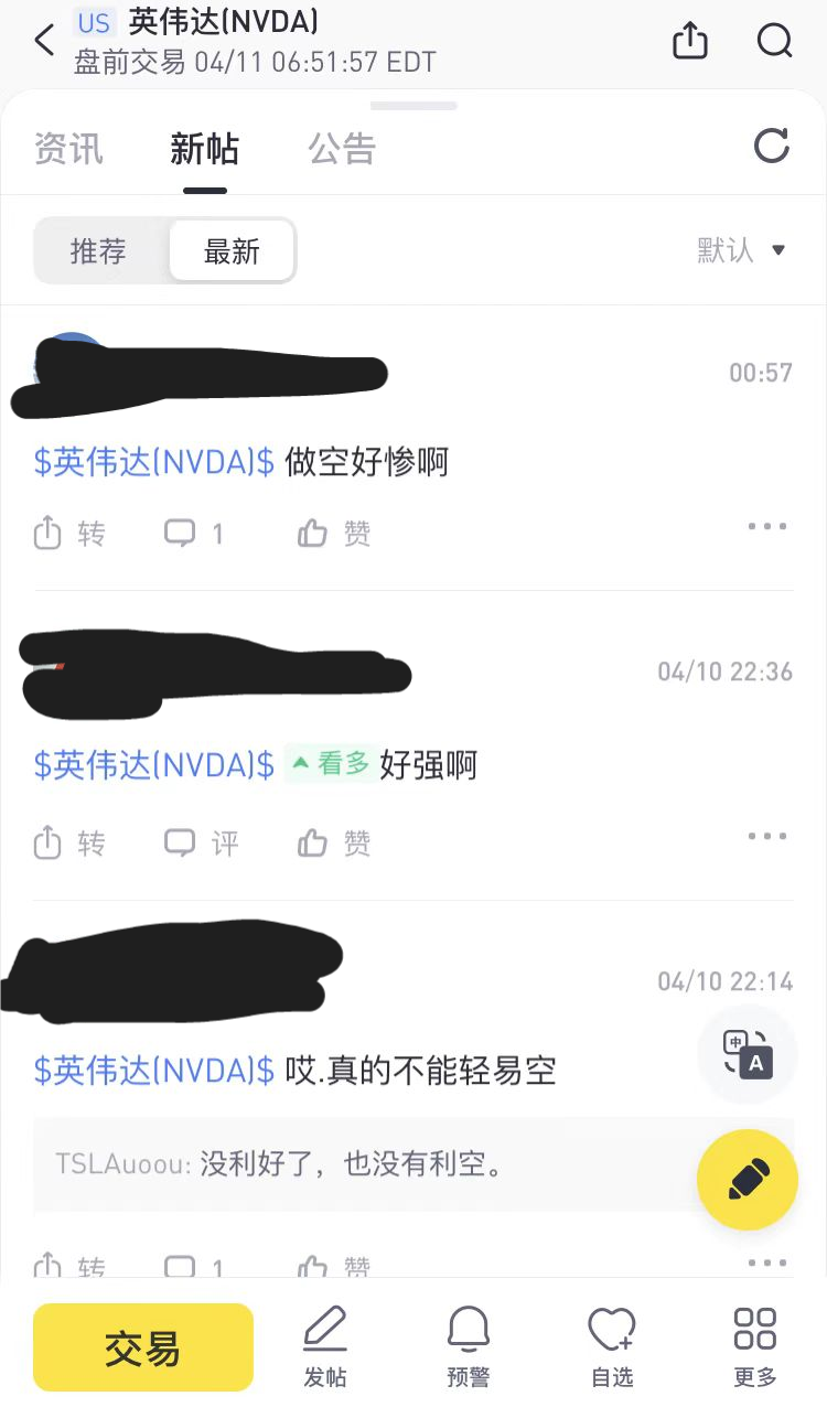 不信就请看 $英伟达(NVDA)$ 标的,在10点的时候,有虎友感叹真的不能轻易空。而在两个小时之后的同一标的下,另一个虎友感叹“做空好惨啊”。