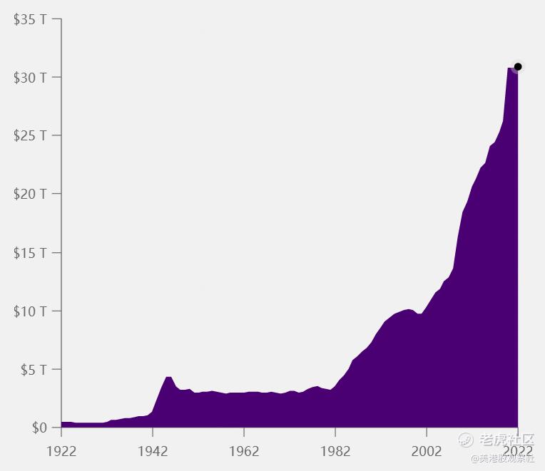仅100年来,美国联邦政府的债务不断飙升,从1922年的4000亿一路飙升到2022年的31万亿,增幅高达75倍。