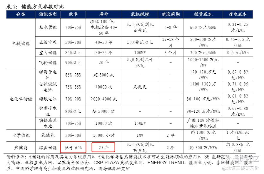 熔盐储能是长时储能的一种技术路线,相较于其它储能方式,它的优点是储能规模大、时间长、寿命长达25年、环保安全,缺点是成本较高、能量利用率较低、以及熔盐具有腐蚀性,对熔融罐、管道等设备具有一定的腐蚀作用。