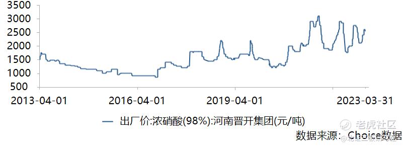 再来看价的状态,根据choice数据信息显示,硝酸钾价格在2022年6月触顶之后便开始了一路下滑,而浓硝酸也是处于自2013年4月以来的历史高位附近徘徊,是否还会继续上涨很难判断,但若是以历史规律来说,当前位置潜在下跌空间是高于上涨空间的。