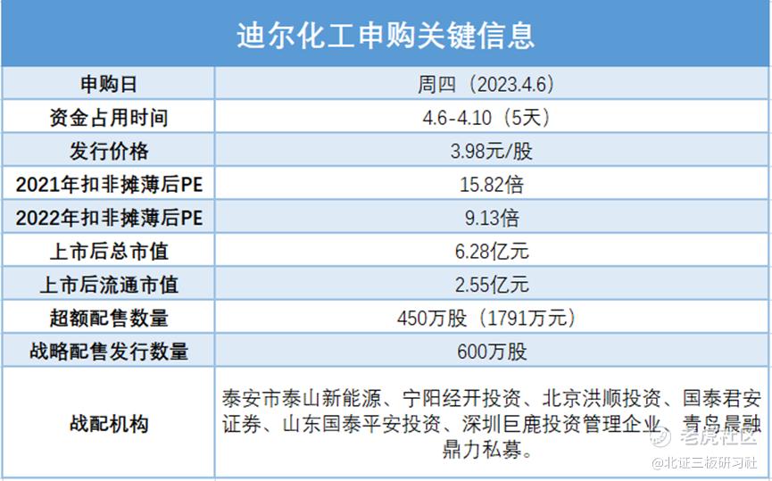 从打新的各项关键信息上看,公司本次发行价格为3.98元/股,绝对价格较低;估值维度,以2022年扣非净利摊薄后计算为9.13倍,个位数的估值看起来很低;流通市值维度,以发行价计预计上市后流通市值将达到2.55亿元,规模不算小,中等体量;从战配机构上看,包括地方国资(泰山新能源、宁阳经开投资、国泰平安)、证券公司(国泰君安)以及新三板私募机构(巨鹿、晨融)等,阵容还是比较亮眼的。