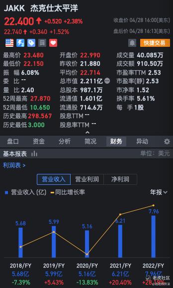 杰克仕太平洋(JAKK) 营收近两年增长很快,营业利润连续5年增长,2020年扭亏,2022年达到0.61亿,净利润受利息费用和非经营亏损影响,2022年才扭亏达到税前利润0.5亿,加上0.41亿的所得税返还,2022年净利润达到0.91亿。