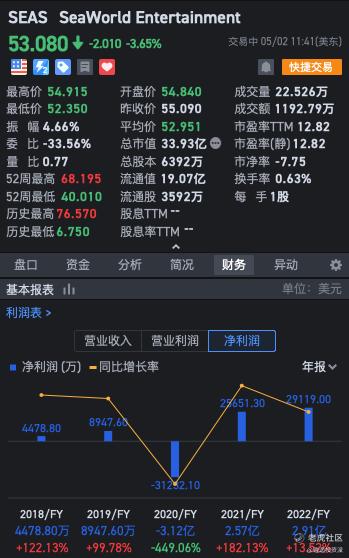 Six Flags Entertainment(SIX) 是做主题公园的,营收除2020年大幅下滑76%以外,基本在14亿上下,营业利润2020年亏损3.35亿,其余4年都盈利,但是近两年利润明显下滑,净利润和营业利润类似,2022年已经跌到了2018年的一半。