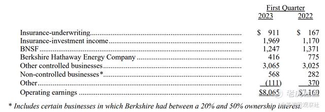 有趣的是,巴菲特对经济的评论与伯克希尔财团的业绩结果有些冲突。2023年第一季度,营运收益同比增长13%,相比2022年同期取得了显著提高,尽管经济环境不利。从一月到三月底,伯克希尔财团累计营运收益为80.7亿美元,得益于保险业务的恢复。