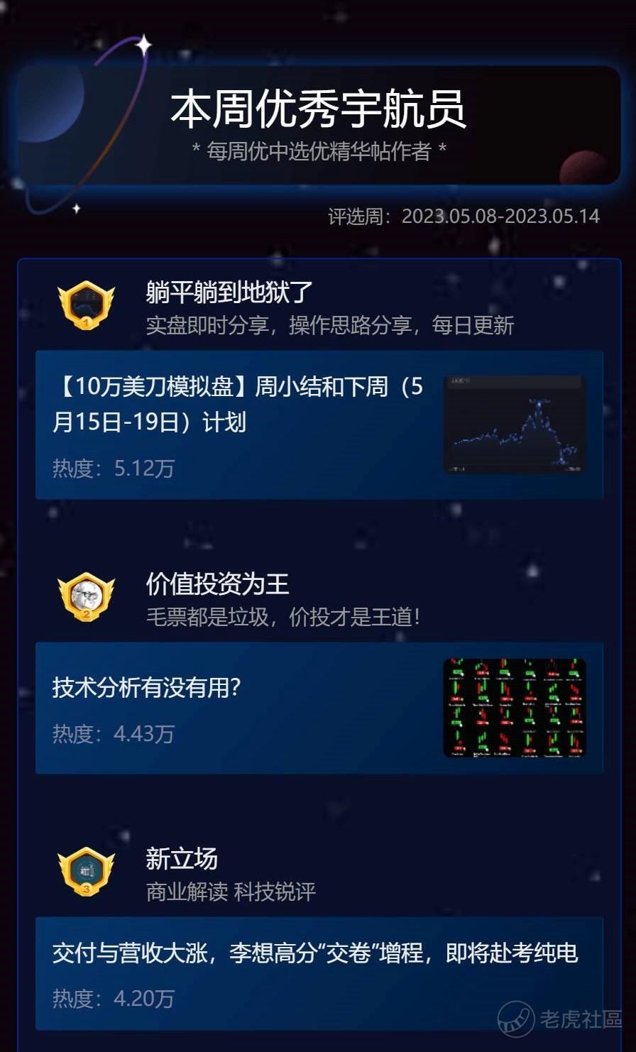 太空探索计划是老虎社区发起的内容激励计划,邀请优质创作者分享自己对金融、股票的见解/心得/分析。凡是参与活动的创作者,都有机会获得虎币,代金券等实物奖励,还有机会获得荣誉勋章,流量支持,官方推荐等多重激励。