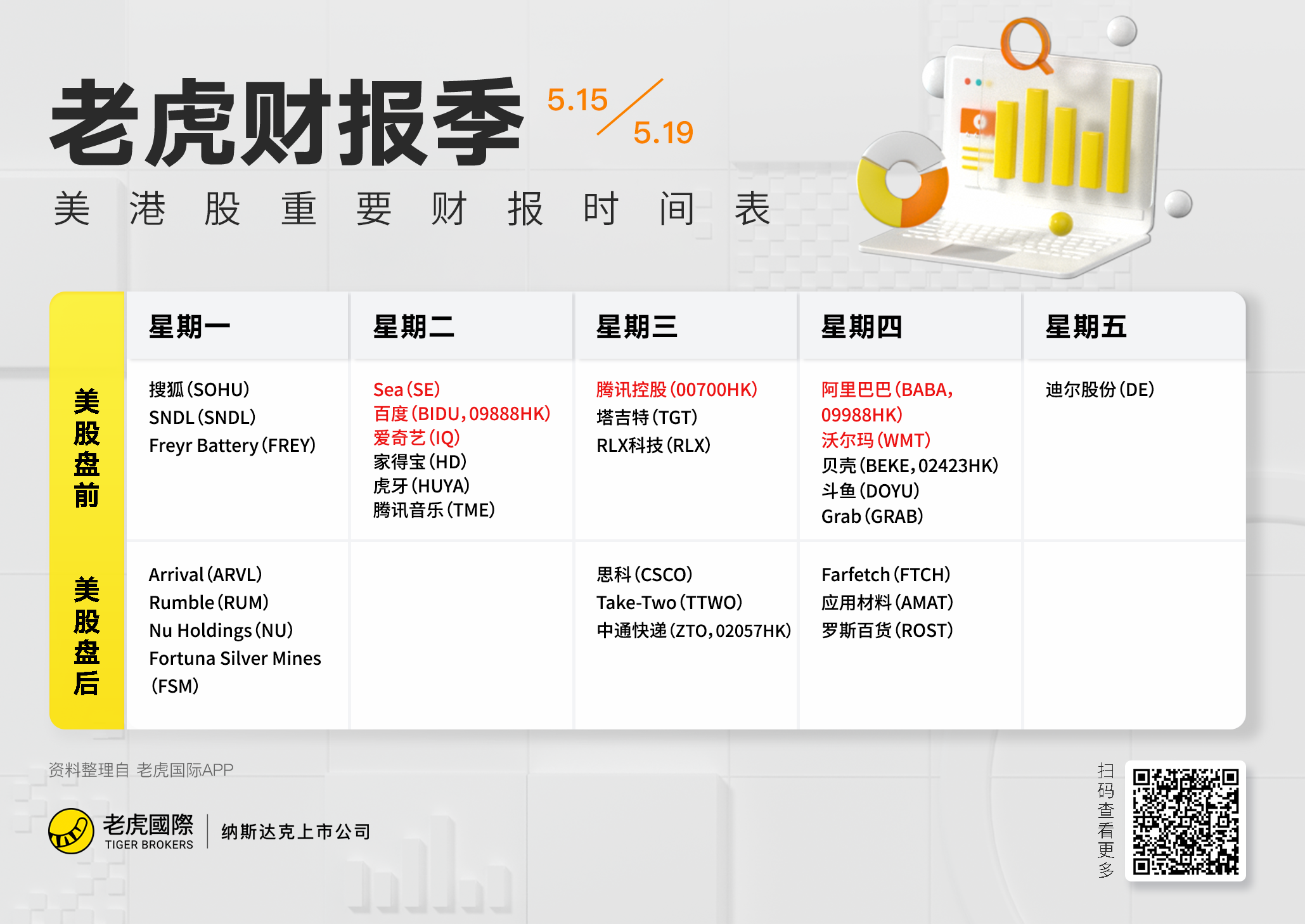 多家公司今日发布财报。港股方面, $腾讯音乐-SW(01698)$ 、名创优品、百度集团-SW等将发布财报。美股方面,家得宝、Sea财报也将于今日公布。