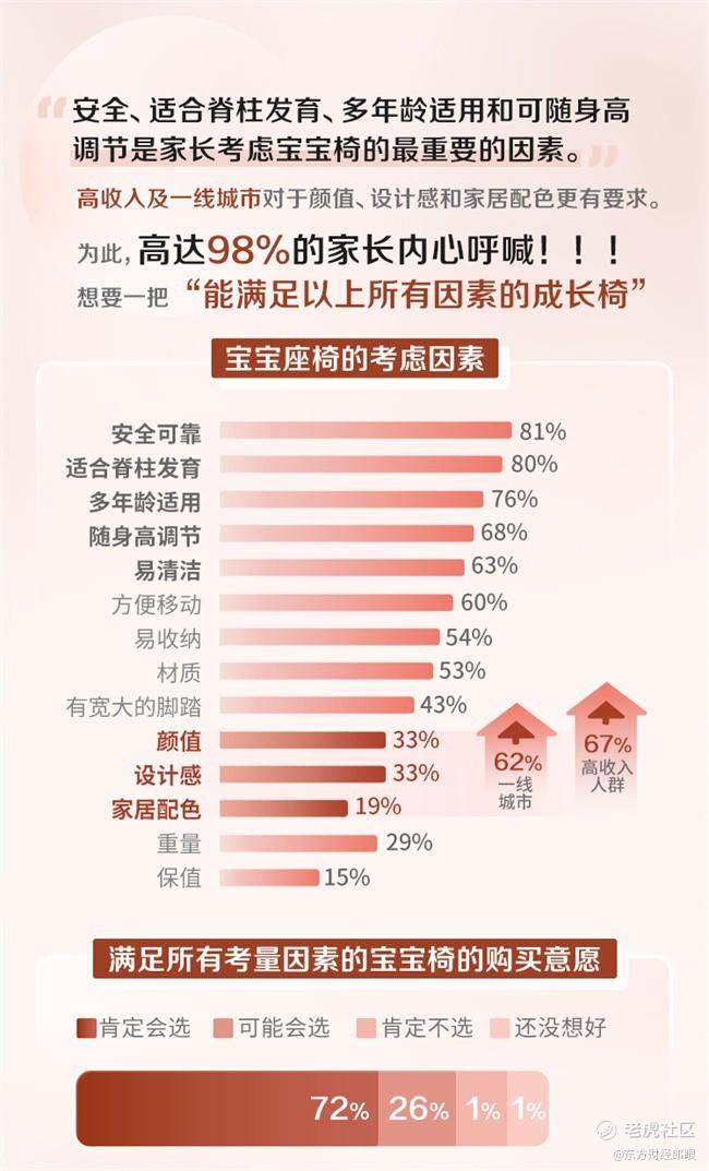 在选购宝宝椅的过程中,安全、适合脊柱发育、多年龄适用和可随身高调节是家长考虑宝宝椅的最重要的因素。高收入人群及一线城市对于颜值、设计感和家居配色更有要求,安全的重要性同样毋庸置疑。一把好的椅子不仅在设计时都非常用心和注重细节,让父母放心,让孩子坐得很舒服,而且还能全方位支持孩子生理和心理的成长。