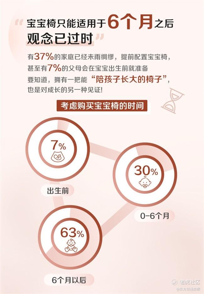 此外,宝宝椅只能适用于6个月之后观念已过时,有37%的家庭已经未雨绸缪,提前配置宝宝椅,甚至有7%的父母会在宝宝出生前就准备。