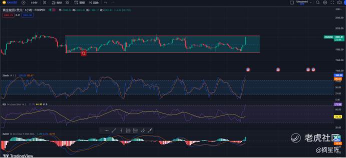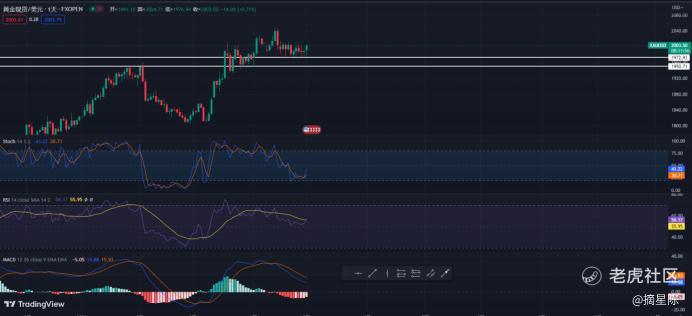 从技术指标分析,Stoch线中D线位于K线下方,这可能表明金价近期走势有所下跌,但是下跌趋势可能已经放缓或即将结束,同时RSI线在44缓慢上升,这表明金价有望上涨,但是涨势可能相对缓慢;而MACD线在零值以上仍在上升,买家柱形图也在逐步上升,这也发出黄金上涨的信号。