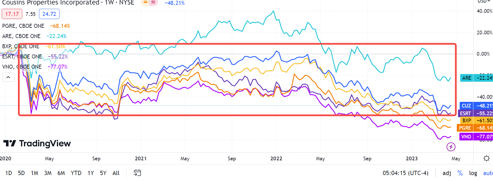 受到SVB银行、Signature银行(已倒闭)、第一共和银行(摇摇欲坠),和遭遇重创的阿莱恩斯西部银行和西太平洋合众银行(遭遇重创)影响的,CUZ, PGRE, ARE, BXP, ESRT, VNO等Reits公司从2023年1月开始明显下跌,并且已经低于2020年疫情低估的价位。