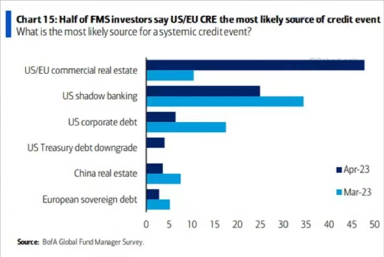 美银也在期最近对其内部基金客户的问卷调查发现:在未来系统性信用事件主要来源的排名次序上,大多数基金经理认为欧美商业房地产、美国影子银行。