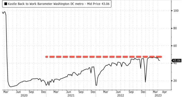 作为衡量办公室入住率趋势的重要指标,房产安全管理公司Kastle Systems提供的刷卡数据显示,华盛顿的办公室平均入住率只有43%,还未回升到新冠疫情前的水平。