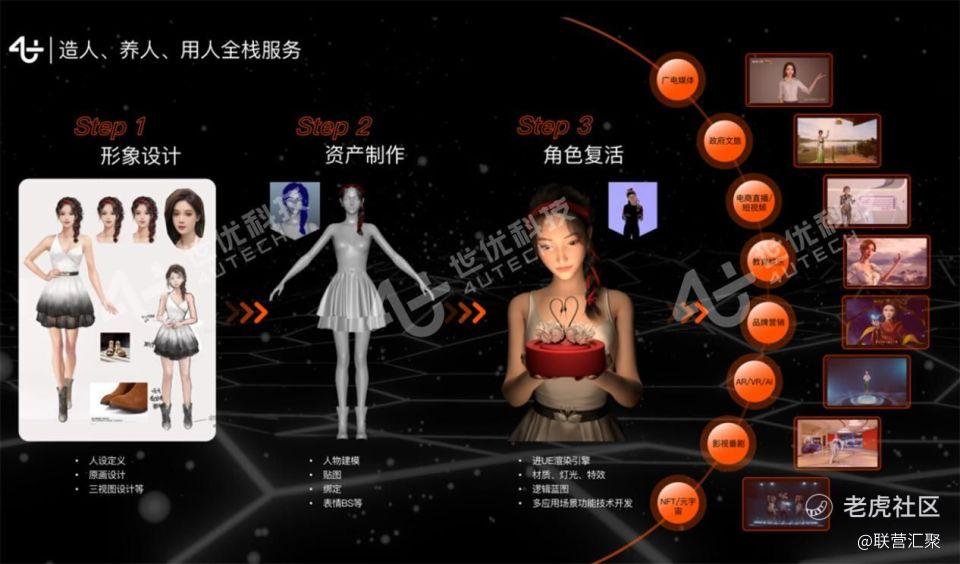 作为一家技术公司,经过多年的发展,我们已形成相对稳固的数字人技术服务产品线。虚拟人的全栈服务主要有三个阶段:造人、养人、用人。造人:通过形象设计、资产制作、角色复活等技术把数字人制造出来;养人:通过大量的内容,让数字人变的人设、形象变的丰富,让其具备影响力和流量;用人:将数字人放到现在应用场景中为企业创造价值,例如虚拟主持人、虚拟主播、虚拟代言人等。